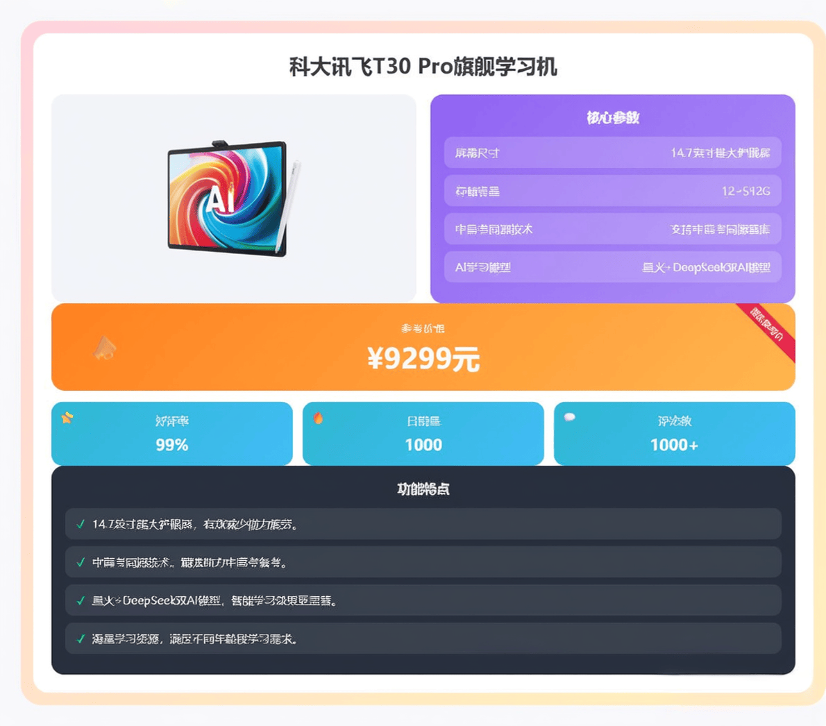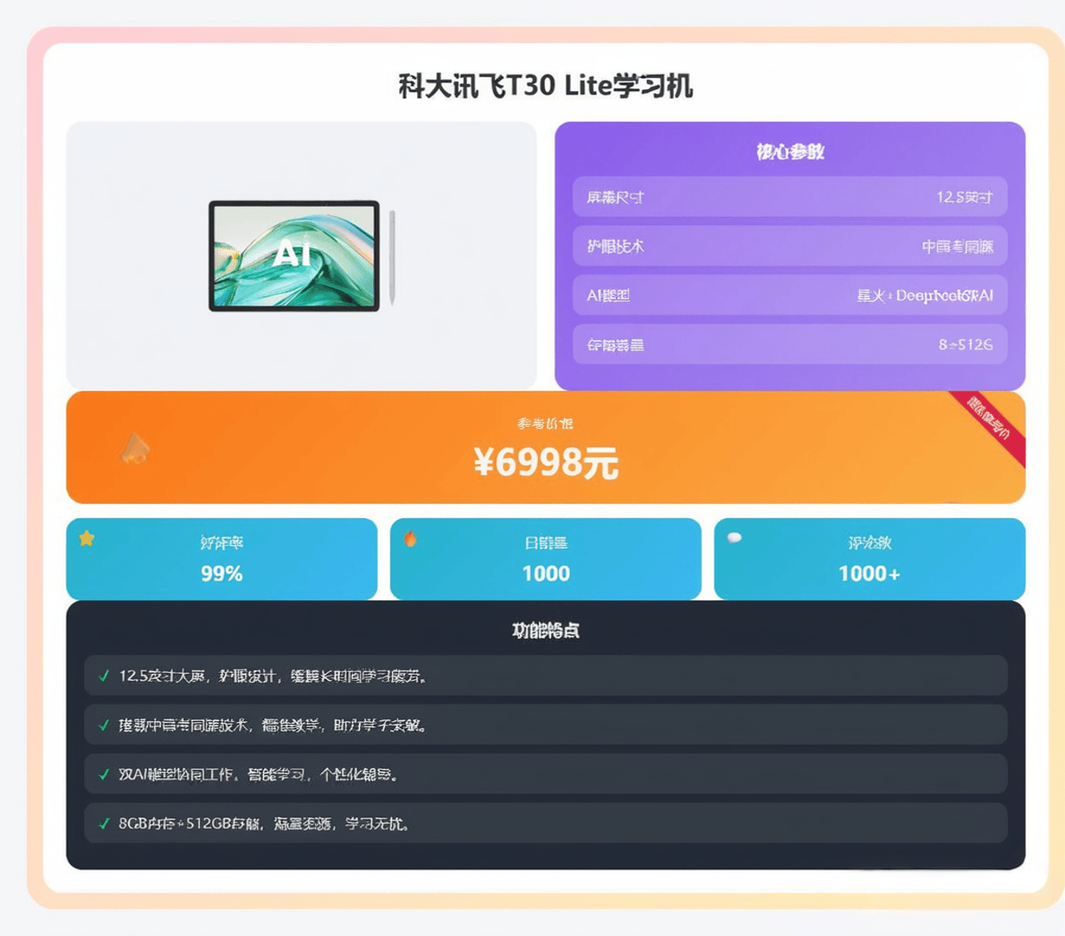 T30 Lite,以换取更低的价钱。则别离针对大屏固定利用和降低旗舰门槛的特定需求。供给了约95%的旗舰体验。特别是10Pro,它完整搭载了讯飞焦点的AI精准学系统,对便携性要求不高的家庭。它同样属于T30旗舰系列,